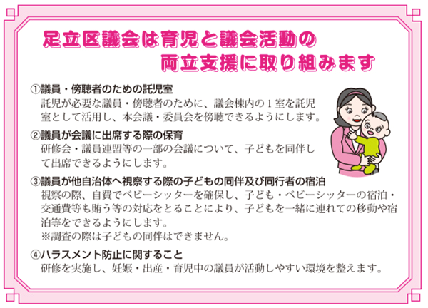 足立区での先進的な取り組み「妊娠・出産・子育てと議会活動の両立支援の制度」。私がハラスメントを議長、そして超党派の議員の皆様に訴えたことにより新制度が発足しました。